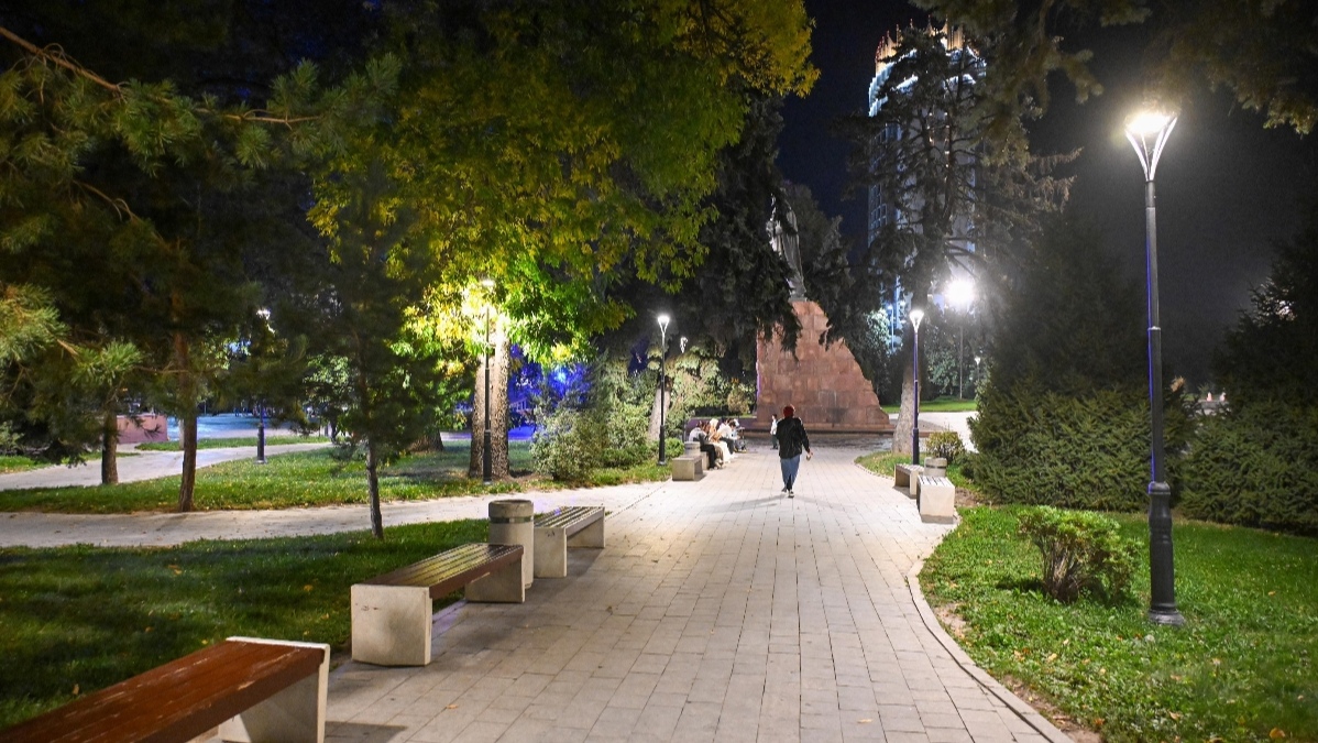 В сквере Дворца Республики 65 торшерных светильников заменены на светодиодные мощностью 100 Вт с тёплым светом. Новые LED-светильники отличаются высокой яркостью, низким энергопотреблением и длительным сроком службы.