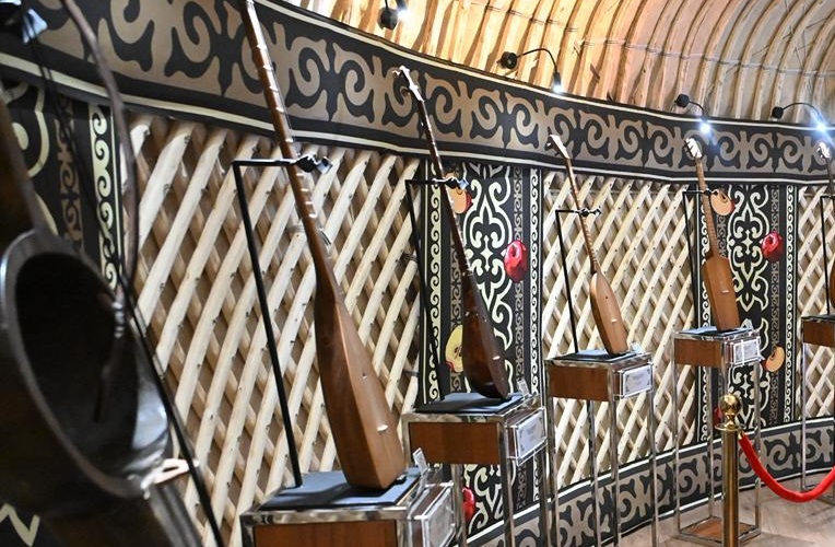 Первая юрта погружает гостей в мир традиционной казахской музыки. В её экспозиции представлены редкие национальные инструменты из фондов Музея народных музыкальных инструментов имени Ыхласа, включая домбры выдающихся деятелей культуры, каждая из которых хранит свою историю и звучание эпохи.
