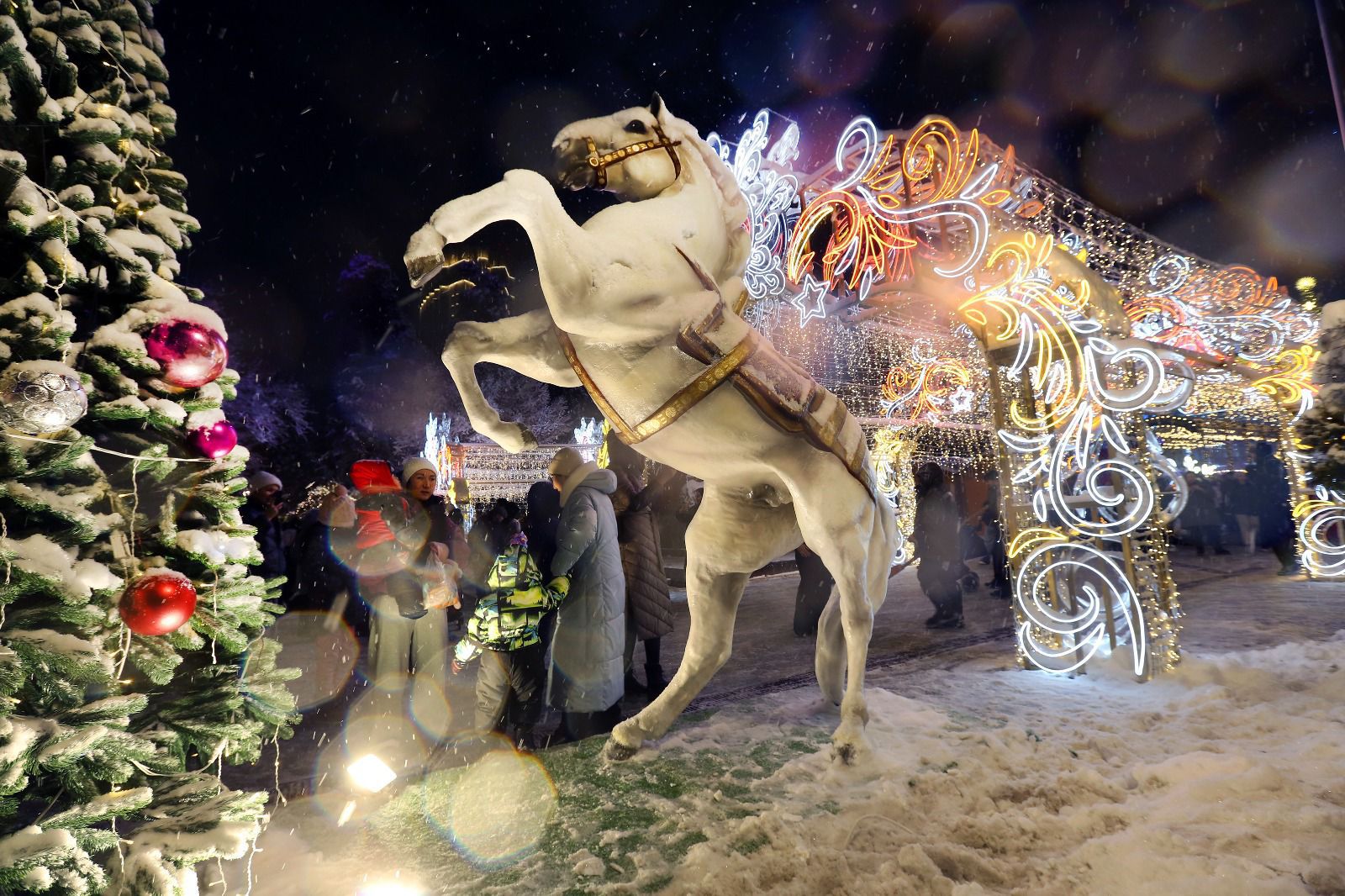Следует отметить, что часть ранее приобретённых новогодних украшений была восстановлена и повторно использована. В текущем году обновлены 56 малых архитектурных форм, включая 4 новогодние ели, 45 праздничных домиков и 7 крупных световых конструкций.