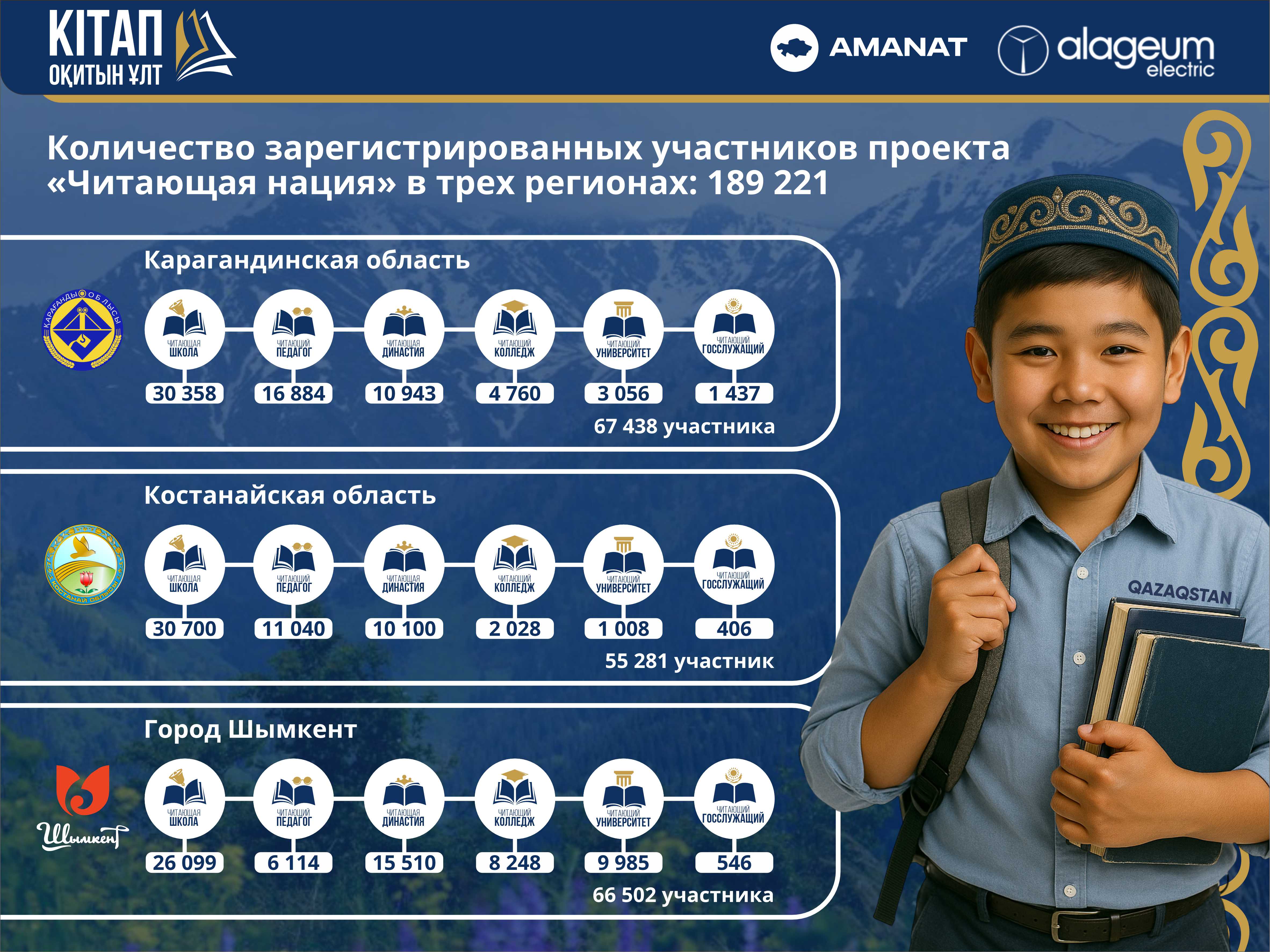 За месяц в трех регионах для участия в проекте зарегистрировались 189 221 участник: Карагандинская область - 67438 участников, Костанайская область - 55 281 участник, г. Шымкент - 66 502 участника.