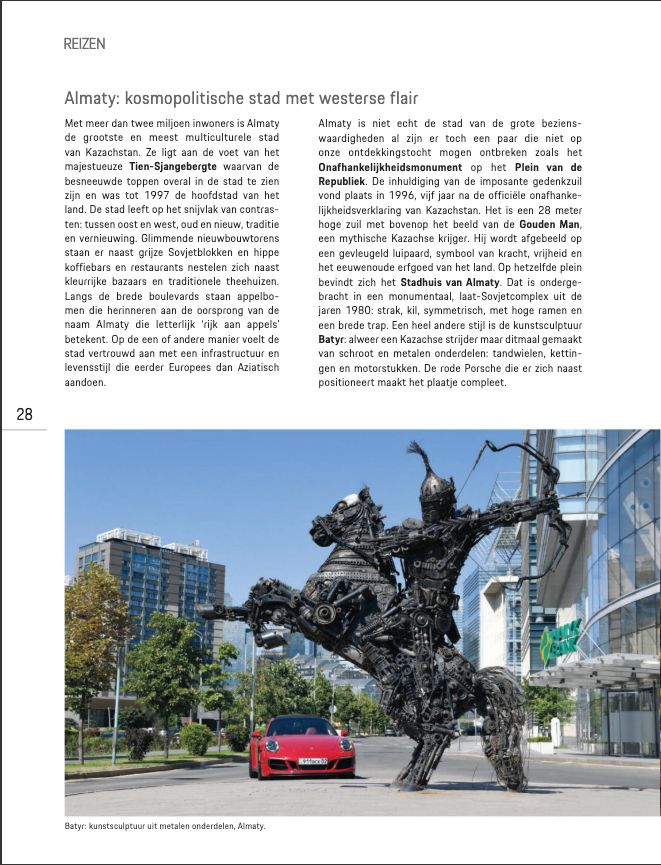 В Европе опубликован специальный выпуск бельгийского журнала Porschist, посвященный Казахстану. В номер вошли пять городов страны – Астана, Алматы, Шымкент, Туркестан и Байконур. Каждый из них представлен как самостоятельное туристическое направление с собственной историей, архитектурой и культурной идентичностью. Об этом сообщили в управлении туризма Алматы.