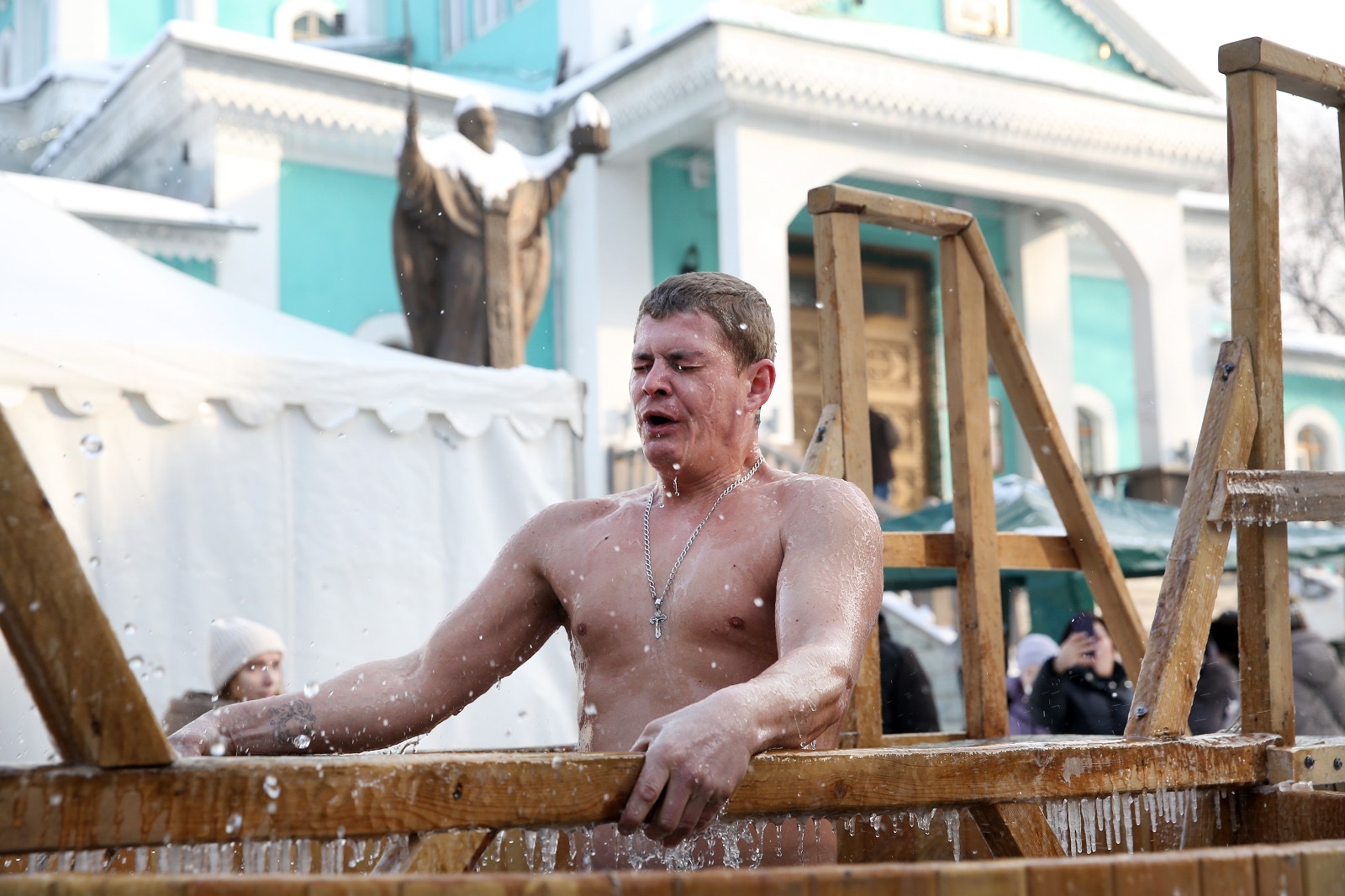 Мужчины и женщины разных возрастов спускались в купель со освященной водой ради духовного очищения в день Крещения Господня.