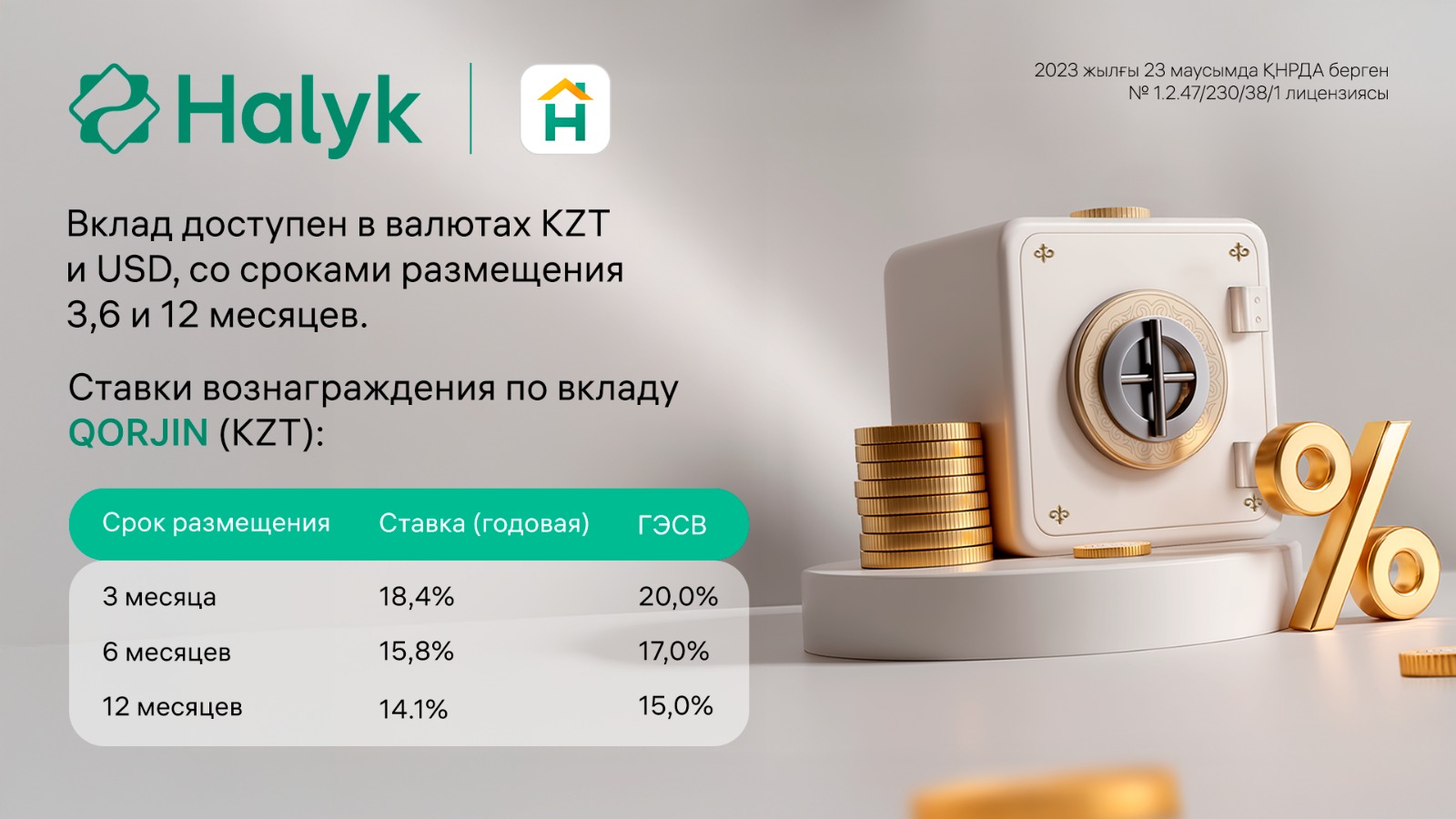 Вклад доступен в валютах KZT и USD, со сроками размещения 3,6 и 12 месяцев.