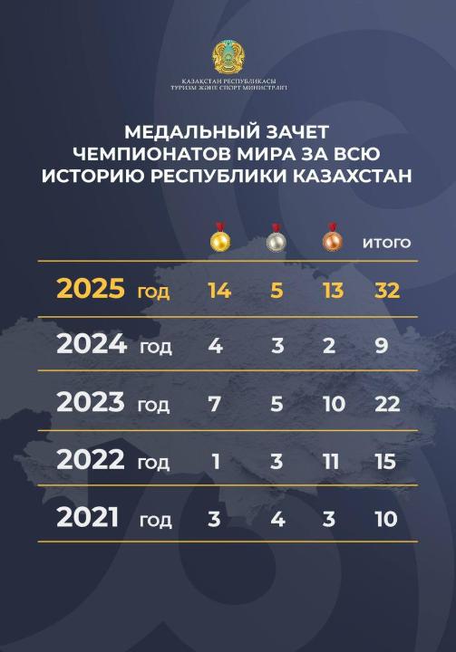 Данный результат является рекордным за весь период независимости Казахстана. Для сравнения, предыдущий рекорд был зафиксирован в 2023 году, когда национальная команда завоевала 22 медали (7 золотых, 5 серебряных и 10 бронзовых). Таким образом, прирост по общему количеству наград в 2025 году составил +10 медалей, а количество золотых медалей увеличилось вдвое.