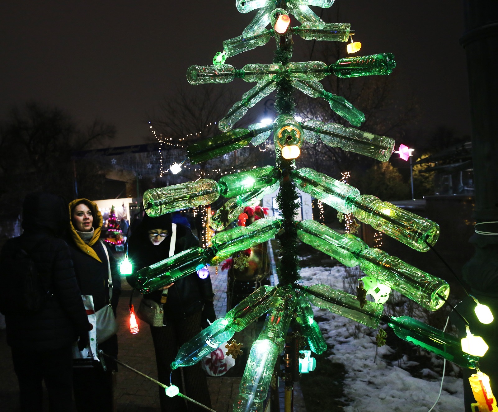 – Ёлки у нас совершенно разные. Есть из ткани, из вторсырья — пластика, бумаги, из проводов, жестяных банок из-под напитков, бутылок, даже из мягких игрушек. Главное условие — экологичность, возможность разборки и повторного использования материалов, — рассказала Александра Кульмайер.