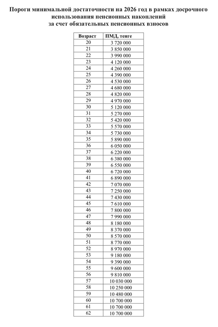 Выполняя требование Социального кодекса, в соответствии с которым ЕНПФ ежегодно не позднее пяти рабочих дней после официального опубликования закона о республиканском бюджете на следующий финансовый год обязан размещать в средствах массовой информации, а также на собственном интернет-ресурсе пороги минимальной достаточности (ПМД) пенсионных накоплений, рассчитанные на предстоящий год, фонд сообщает о ПМД на 2026 год.