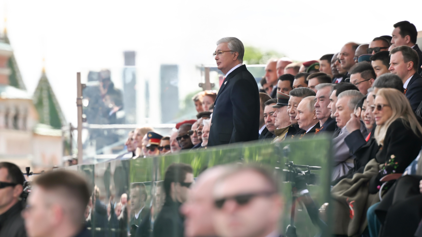 Наряду с Касым-Жомартом Токаевым и Президентом России Владимиром Путиным на трибунах присутствовали Председатель Китайской Народной Республики Си Цзиньпин, Президент Узбекистана Шавкат Мирзиёев, Президент Кыргызстана Садыр Жапаров, Президент Таджикистана Эмомали Рахмон, Президент Туркменистана Сердар Бердымухамедов, Премьер-министр Армении Никол Пашинян, Президент Беларуси Александр Лукашенко, Президент Сербии Александр Вучич, Премьер-министр Словакии Роберт Фицо, Председатель Президиума Боснии и Герцеговины Желька Цвиянович, Генеральный секретарь ЦК Коммунистической партии Вьетнама То Лам, Президент Монголии Ухнаагийн Хурэлсух, Президент Египта Абдель Фаттах Ас-Сиси, Президент Бразилии Луис Инасиу Лула Да Силва, Президент Венесуэлы Николас Мадуро, Президент Кубы Мигель Диас-Канель, Глава Государственного административного совета, Премьер-министр Мьянмы Мин Аун Хлайн, Президент Буркина-Фасо Ибрагим Траоре, Президент Гвинеи Бисау Умару Сисоку Эмбало, Президент Зимбабве Эммерсон Дамбудзо Мнангагва, Президент Республики Конго Дени Сассу-Нгессо, Президент Экваториальной Гвинеи Теодоро Обианг Нгема Мбасого, Президент Эфиопии Тайе Ацке-Селассие, Президент Палестины Махмуд Аббас, а также руководители международных организаций.