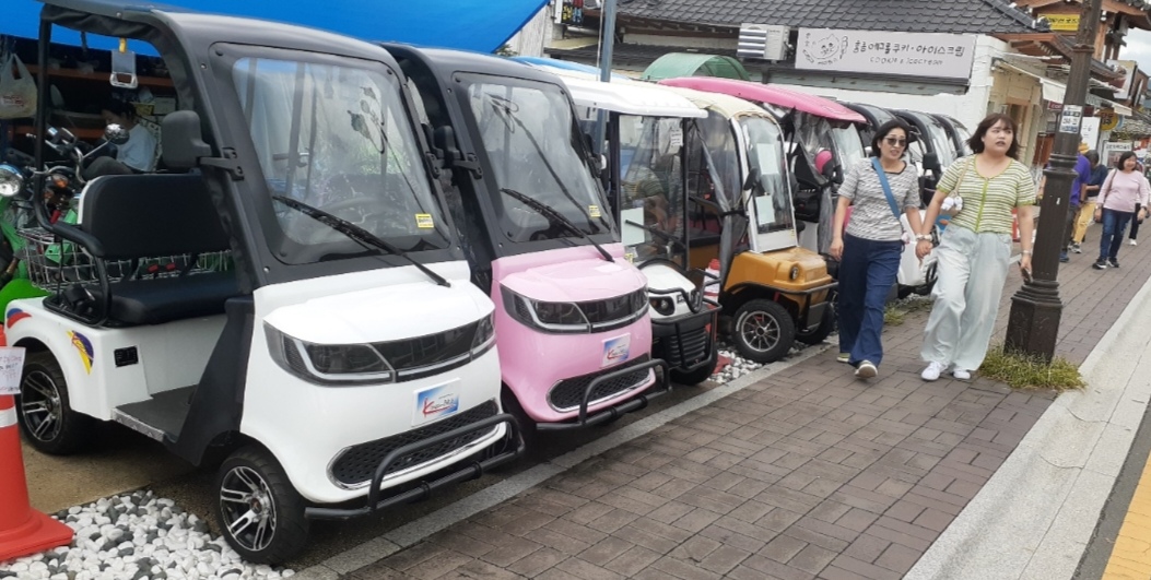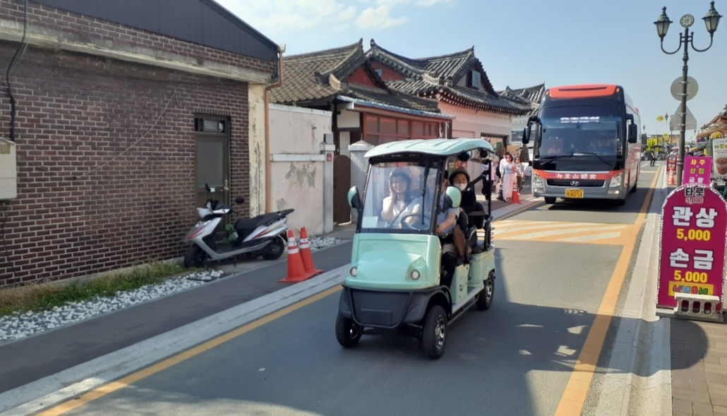 На улицах Кёнджу множество аллей, а по улицам разъезжает много экологичных транспортных средств, в том числе удобные для туристов крошечные автомобили без дверей.