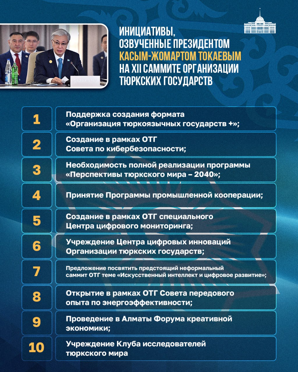 – Недавно в Астане открылся Международный центр искусственного интеллекта Alem.AI. Предлагаю на его базе создать Центр цифровых инноваций Организации тюркских государств, который будет поддерживать стартапы, развивать совместные проекты, обеспечивать обмен опытом в сфере ИИ и привлекать венчурный капитал. Следует рационально использовать потенциал цифровизации и ИИ во благо наших народов, а также предотвращать риски и вызовы, связанные с новыми технологиями. Поэтому предлагаю посвятить неформальный саммит Организации, который пройдет в следующем году в Казахстане, теме «Искусственный интеллект и цифровое развитие». Мы готовы организовать международную конференцию с участием квалифицированных экспертов в преддверии этой встречи, – предложил Президент.