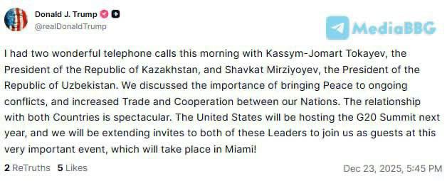 «Сегодня утром у меня был замечательный телефонный разговор с Касым-Жомартом Токаевым, президентом Республики Казахстан. Мы обсудили важность установления мира в текущих конфликтах, а также расширение торговли и сотрудничества между нашими странами. Отношения с обеими странами впечатляющие. США будут принимать саммит G20 в следующем году, и мы пригласим лидера присоединиться к нам в качестве гостей на этом очень важном мероприятии, которое пройдет в Майами», – написал президент США.