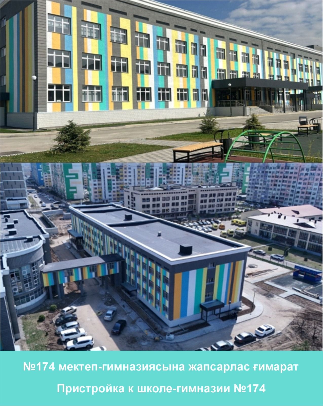 В Наурызбайском районе построена новая пристройка к школе-гимназия №174. Современное здание оснащено мультимедийными кабинетами, спортивным залом, буфетом и рекреационными зонами. Учебные помещения оборудованы современными техническими средствами и интерактивными панелями, обеспечивая высокий уровень образовательного процесса.