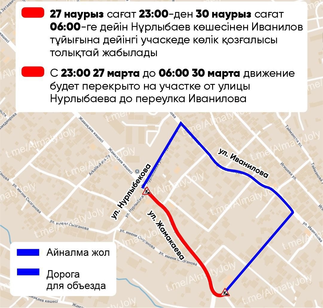 Так, с 23:00 27 марта до 06:00 30 марта движение будет перекрыто на участке от улицы Нурлыбаева до переулка Иванилова.