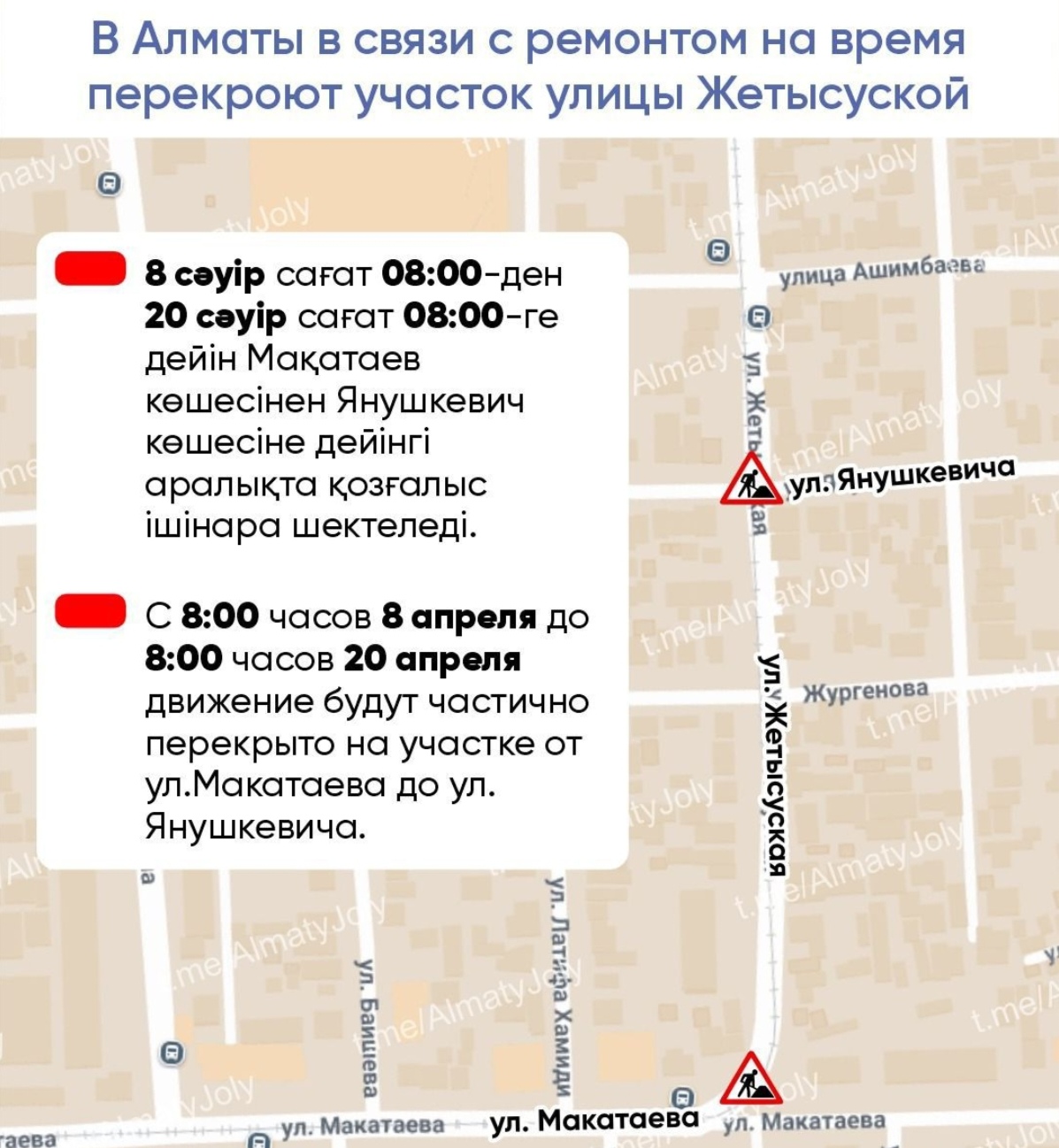Так, с 8.00 8 апреля до 8.00 20 апреля движение будут частично перекрыто на участке от ул. Макатаева до ул. Янушкевича.