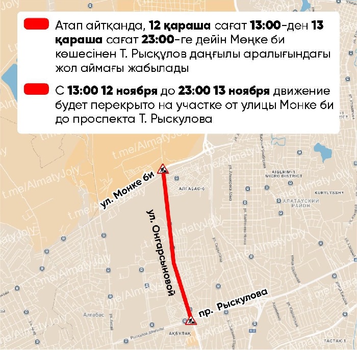 Так, 13:00 12 ноября до 23:00 13 ноября движение будет перекрыто на участке от улицы Монке би до проспекта Т. Рыскулова.