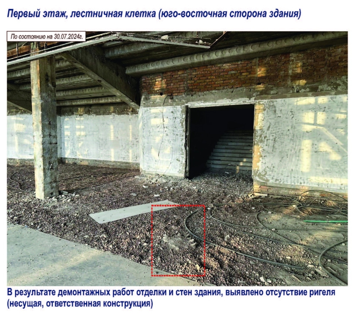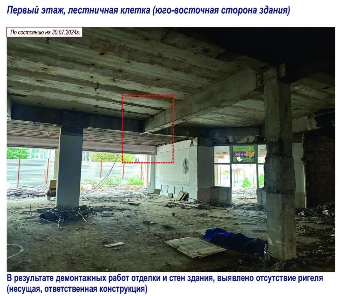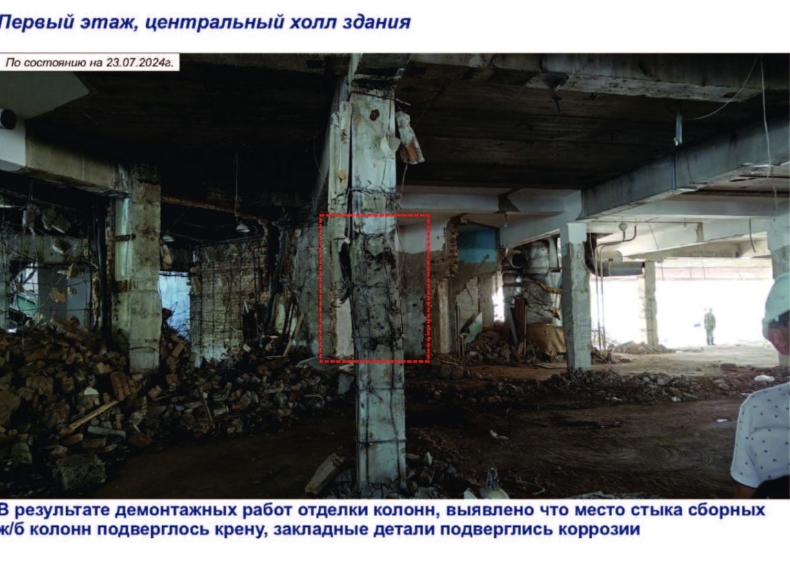 В 2023 году аккредитованная организация провела обследование, выявив серьёзные дефекты несущих конструкций: отсутствие отдельных ригелей и стен, коррозию и деформацию колонн, нарушение соединений, разрушение теплоизоляции и повреждения кровли. Большинство дефектов скрыты под отделкой.